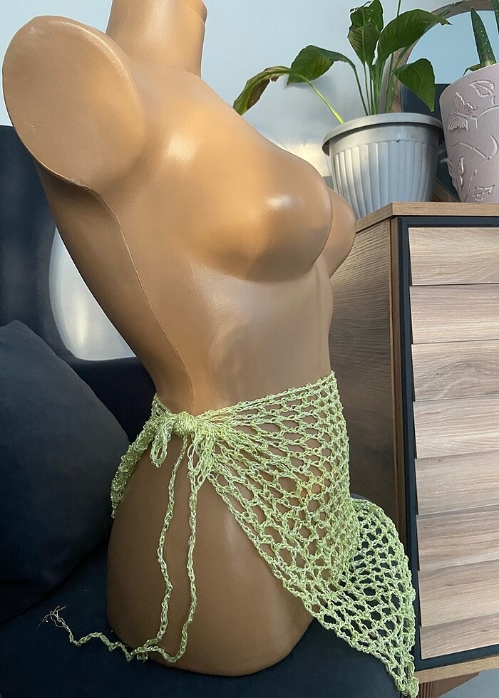 Açık yeşil renkli Simli parlak ipten örülmüştür. Yandan bağlamalıdır s-m uyumludur