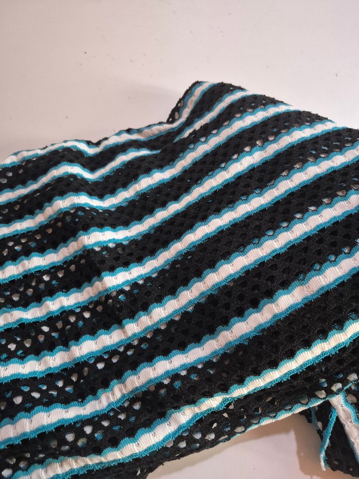 desenlere sahip, siyah, mavi ve beyaz çizgilerle çok renkli koyu tonlarda yelek kazak da dikilir metre işi satılır