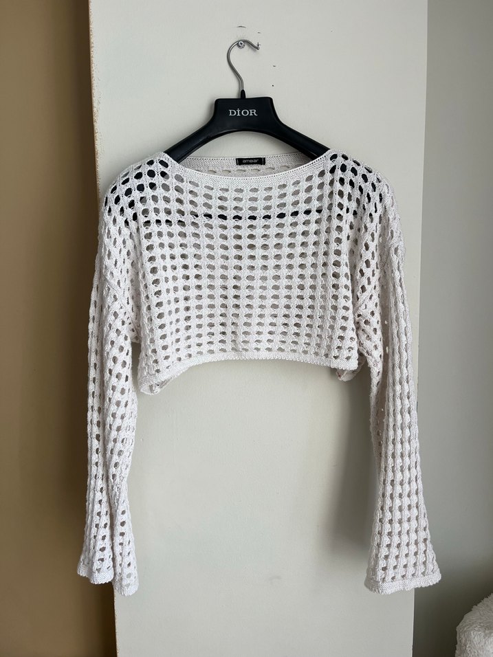 Beyaz renkli, uzun kollu, yuvarlak yakalı, kısa kesim örgü kadın kazak. Gevşek ve delikli dokusuyla modern sokak stili sunar. Standart bedendir