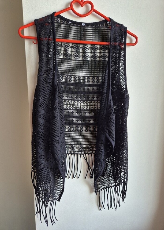 Siyah File Yelek yenidir kullanilmadi plaj giyim ya da normal giyim icin uygundur. 36-38 beden uyumludur. Boy olcusu gorselde mevcut iki koltuk arasi 40 cm.