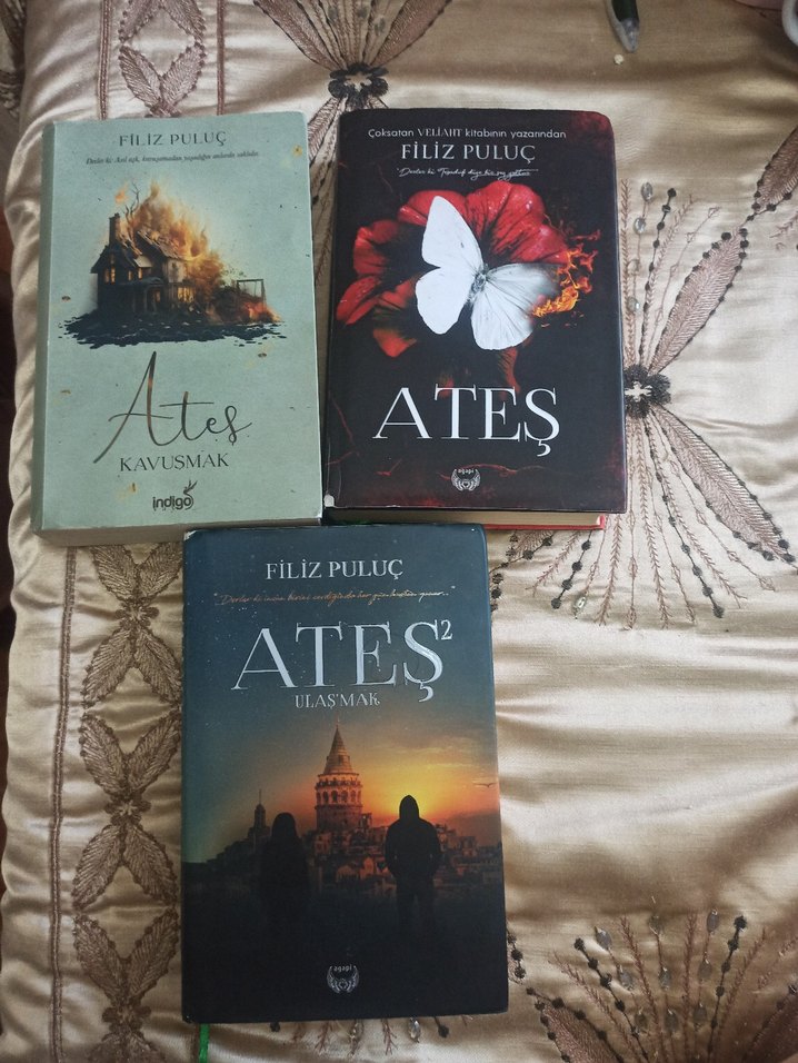 Filiz Puluc'un "Ateş" serisinden üç roman: "Ateş," "Ateş Kavuşmak" ve "Ateş 2 Ulaşmak." Her biri farklı kapak tasarımına sahip. ikisi eski basım 3. kitap yeni