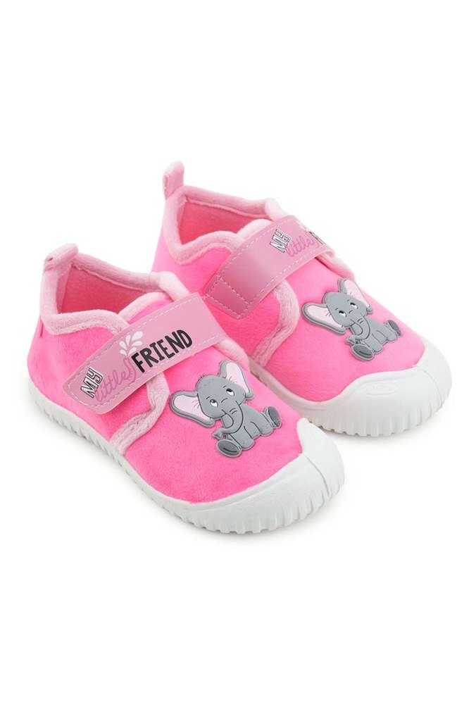 Yumuşak polar kumaştan yapılmış, fil desenli ve cırt cırtlı pembe kız çocuk sıcak ev terliği. "FRIEND" yazısı bulunur.