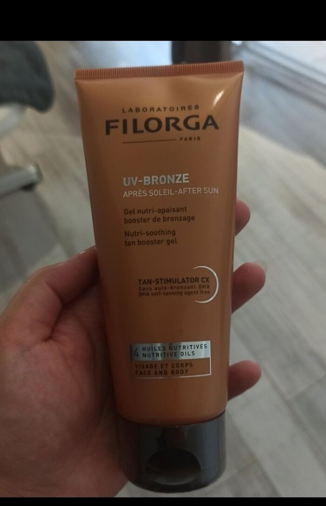 Filorga UV-Bronze güneş sonrası jel, cildi yatıştırır ve besler, bronzlaşmayı destekler. Yüz ve vücut için besleyici yağlar içerir.