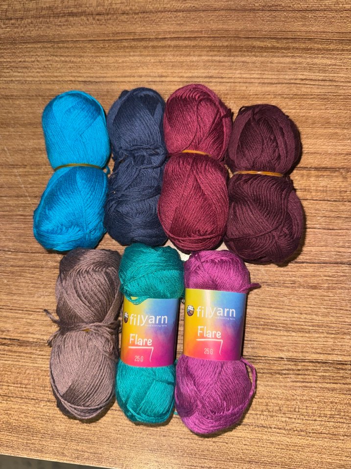 Filyarn Flare koleksiyonundan 25 gram ağırlığında, bohem tarz el işleri için çeşitli renklerde ip seti. Her bir yumak20₺ set 100₺