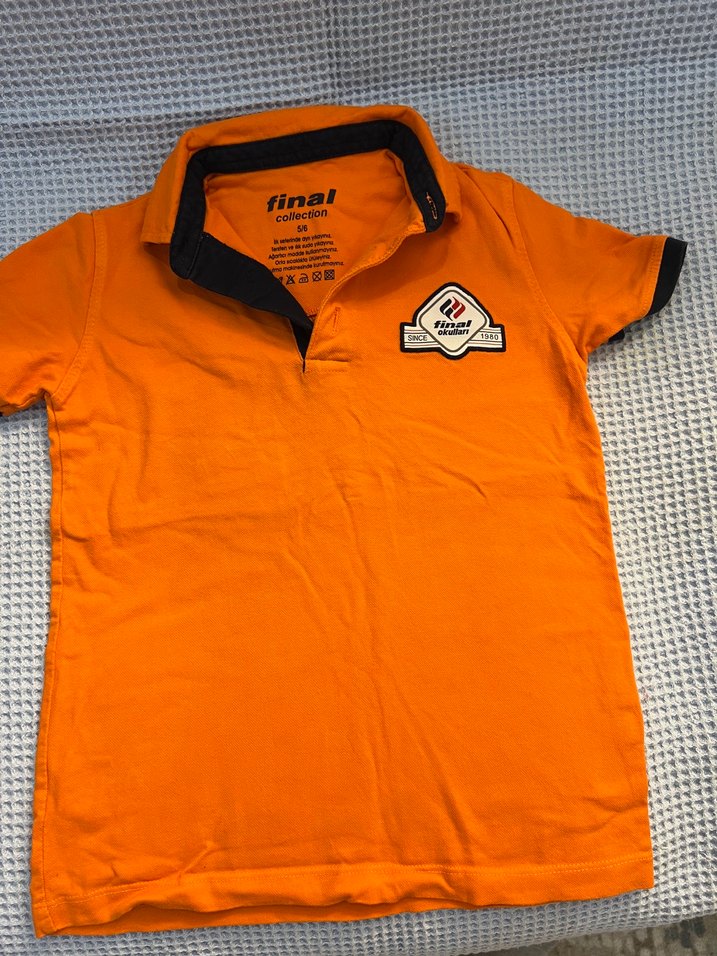 Renkli turuncu erkek çocuk polo tişört, düğmeli yakalı ve kısa kolludur. Baskılı patch ve yumuşak, sıcak kumaşa sahiptir.