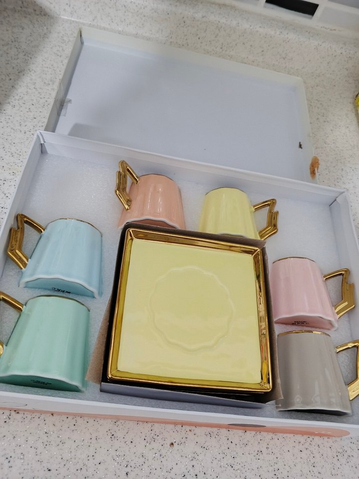 Altı adet pastel renkli seramik fincan, altın renkli kulplar ve uyumlu kare tabak ile birlikte. Canlı ve şık bir sunum seti. ☕