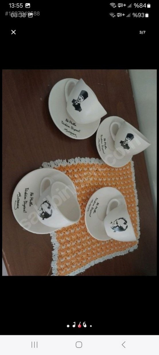 Atatürk portreleri ve sözleriyle süslenmiş beyaz fincan takımı, her biri altlıkla birlikte. Kahve veya çay servis için uygundur. ☕