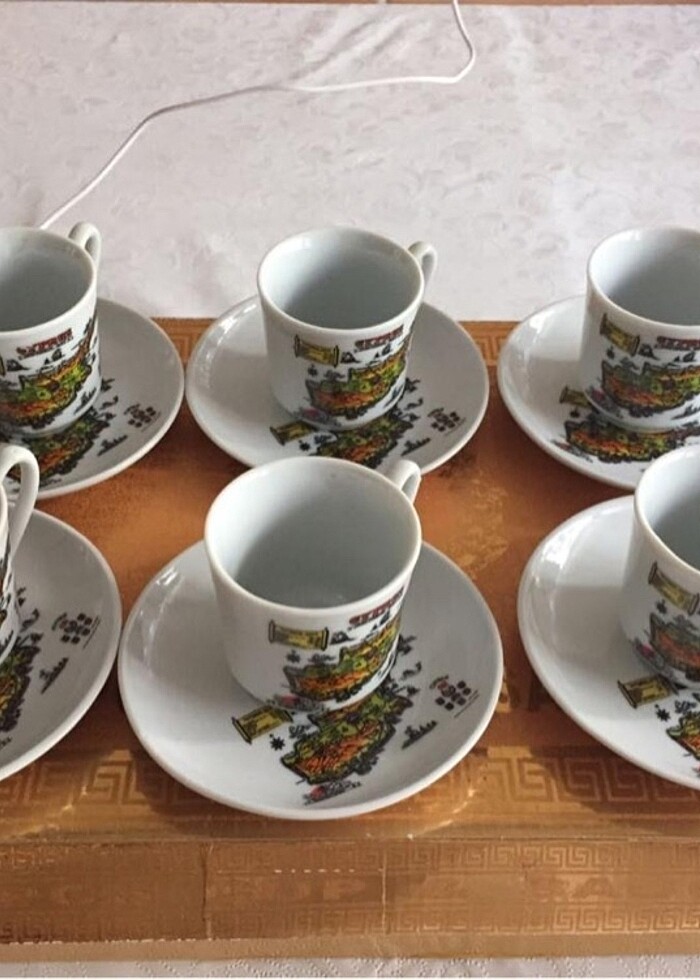 Kıbrıs haritası desenli fincan takımıdır. 6 adettir adet fiyatıdır. Bi adet fincanın ucunda kırık mevcut. Başka herhangi bit deformasyon yoktur.