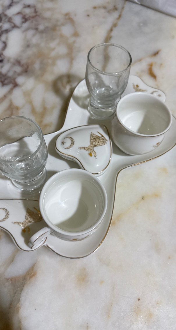 Altın detaylı beyaz seramik fincan ve bardak seti, kalp şeklinde tabak ve tepsiyle birlikte sunulur. ☕ iki kişilik takım fincan marka temsilidir