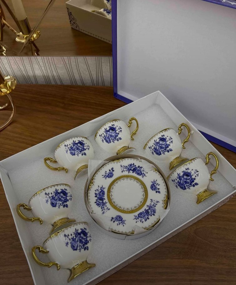 Altın detaylı, mavi çiçek desenli porselen fincan takımı, kutusunda. Çay veya kahve sunumu için uygundur. ☕