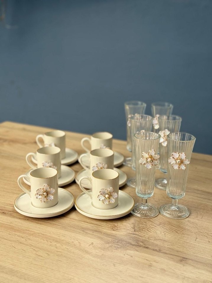 Özel üretim lüks porselen çiçekli fincan ve flüt bardak seti Fiyatlar: 18 parça tüm set 1.350₺ 6lı 12 parça fincan fiyat 950₺ 6lı Flüt bardak 550₺ Ptt kargo 240 Mng kargo 170 KodHk Beyaz fincanlar ve uzun bardaklar, zarif çiçek desenleriyle. Fincanlar için uyumlu tabaklar dahil.