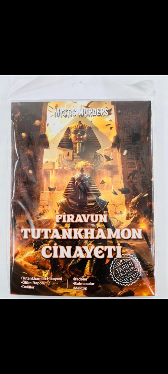 Tutankhamon'un hikayesi, mektuplar, bulmacalar, deliller ve ölüm raporu içeren mitoloji kitabı. Tarihi gizemler sunar.