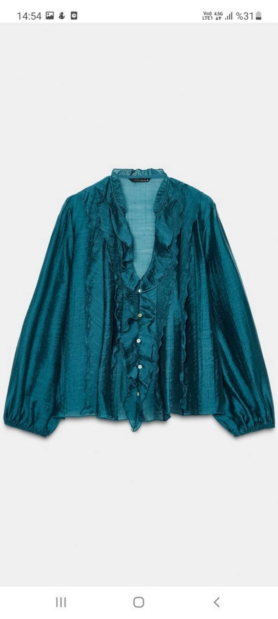 Fırfırlı, yakalı ve uzun kollu, gömlek. Parlak görünümlü, midi boyda, ofis kullanımı için uygun. #zara s bedene uyumlu