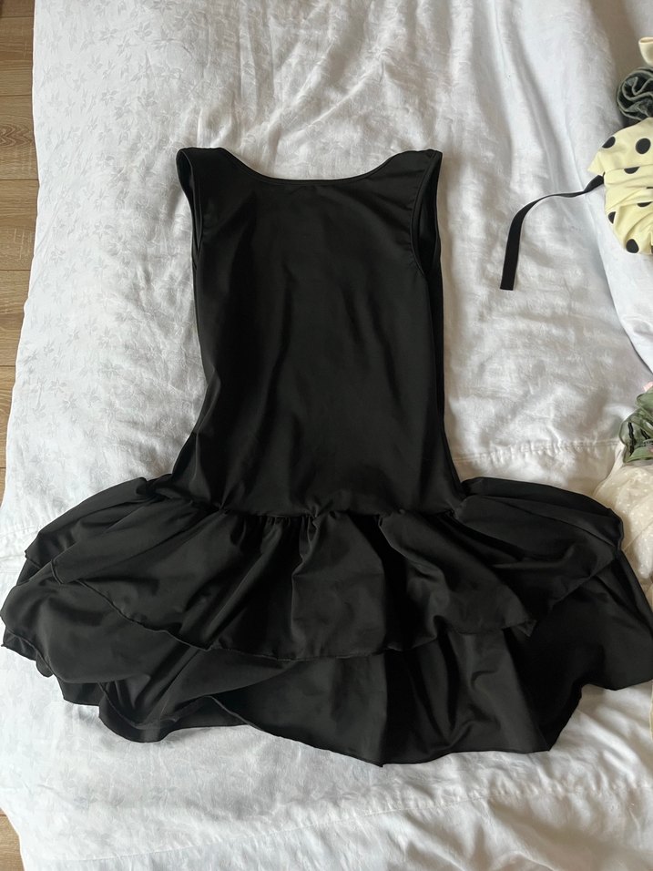 Siyah, straplez yaka, kolsuz ve vücuda oturan mini elbise, fırfır detaylı etek. S beden bu ama M bedene de uyar esnek bir kumaşı var. Hiç giymedim.