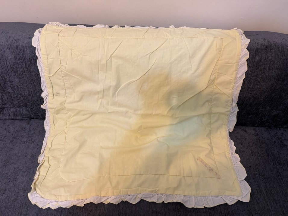 Pastel Sarı ve beyaz renkte. Fırfırlı. Kundak yapılması için düşünülmüş cirt cirt detayı bulunuyor. Elyaflı. Kusuru yok