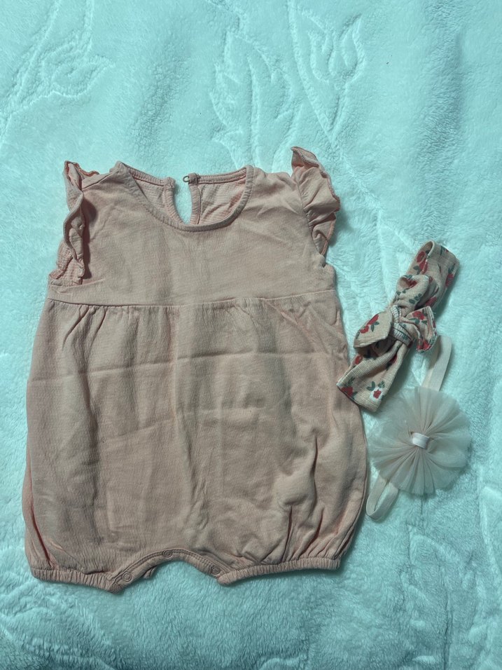 Yavruağzı renginde bebek tulum 6-9 aylık için uygundur. Yanında 2 tane bandana hediye ediyorum.
