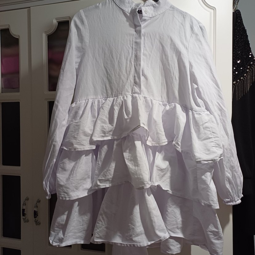 Fırfırlı ve yüksek yakalı, beyaz. Bohem tarzda,, günlük kullanıma uygun rahat kesim.
