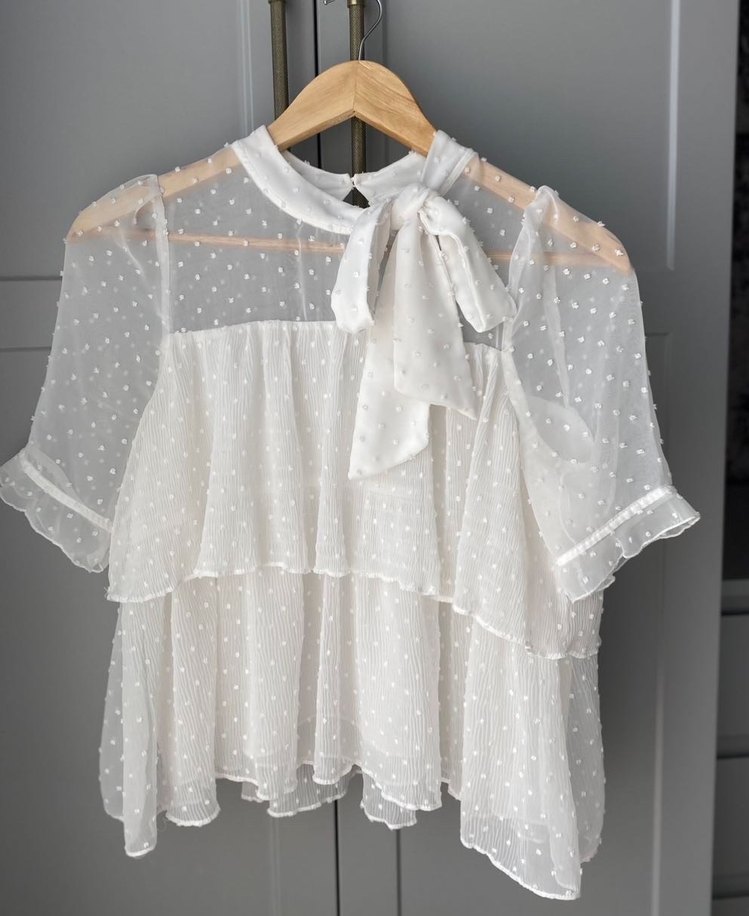 Bu beyaz bluz kısa kollu, yüksek yakalı ve fiyonk detaylıdır. Hafif sentetik kumaştan üretilmiş, fırfır ve katmanlı tasarıma sahiptir. Günlük kullanım için uygundur.