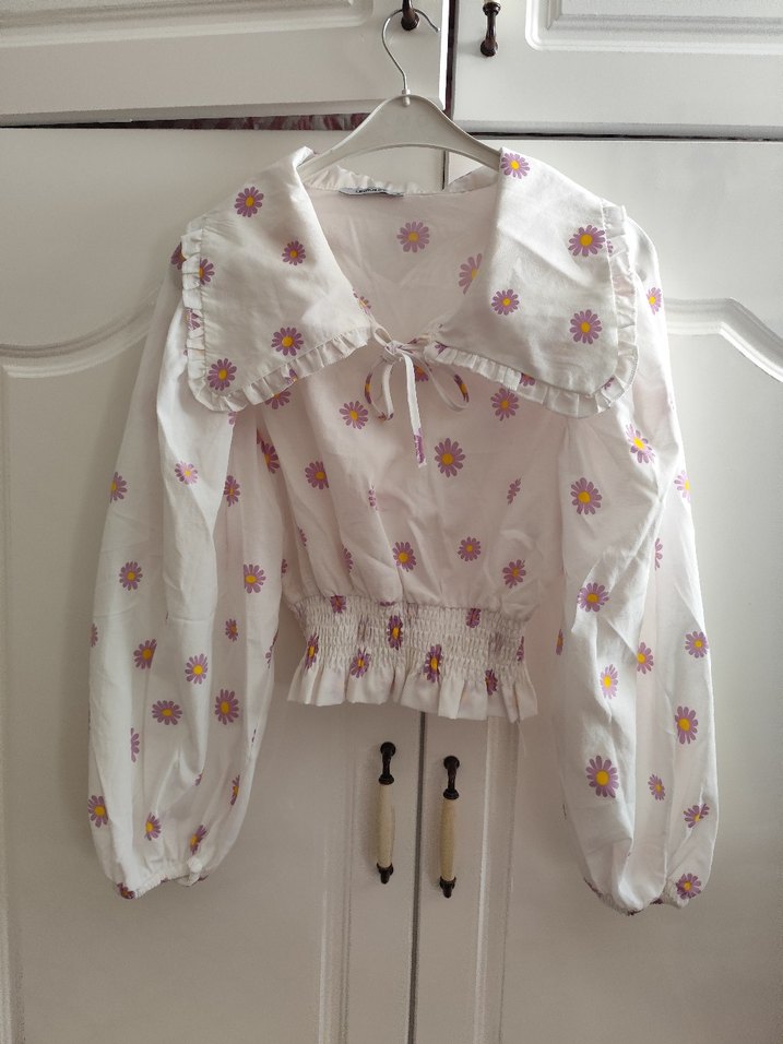 Beyaz, büyük yakalı ve fırfırlı bu gömlek, bol kesim ve pastel çiçek desenleriyle vintage tarz sunar. Uzun kollu ve büzgülü bel detaylıdır.