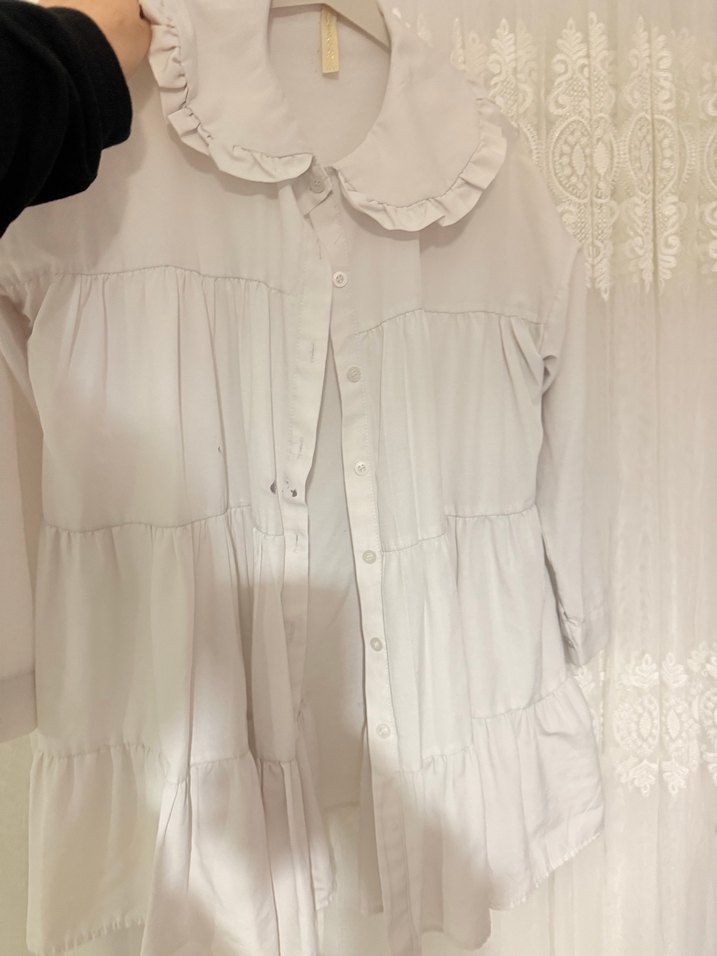 Bu beyaz hamile bluzu fırfırlı yakaya ve nakış detaylarına sahiptir. Uzun kollu, bol kesim ve yumuşak, nefes alabilen ketenden üretilmiştir. Midi boyda ve bohem tarzda, günlük kullanıma uygundur.