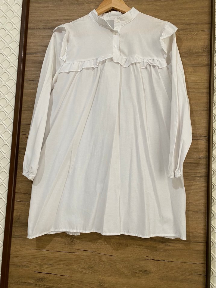 Uzun kollu, yüksek yakalı beyaz keten hamile bluzu. Göğüs kısmında fırfır detayı vardır, günlük kullanım için rahat ve bohem tarzda.