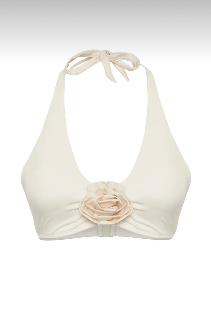 Fırfırlı çiçek detayı ve ipli askılı beyaz, vücuda oturan bikini üstü, cesur plaj stilleri için uygun. 34 36 38 beden