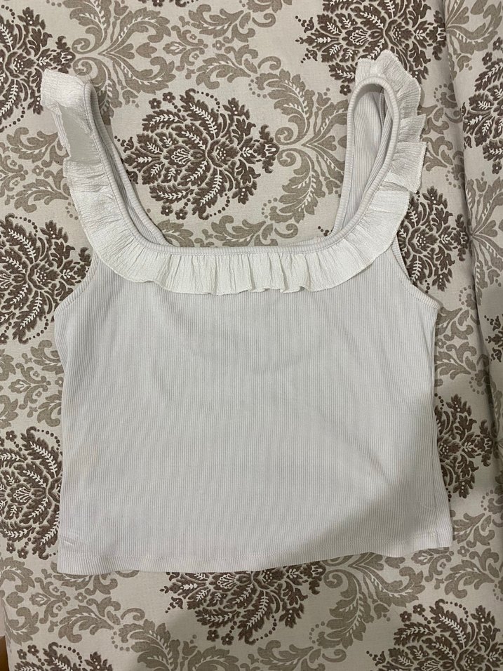 Fırfırlı detaylı, beyaz renkli, kolsuz kadın atlet. Günlük kullanıma uygun, vücuda oturan kesime sahip. Hiçbir sorunu yok