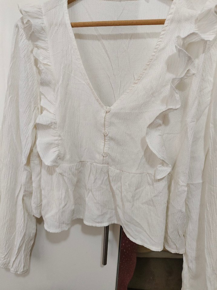 Bu beyaz bluz, V yakalı ve fırfır detaylara sahip, yumuşak keten kumaştan ve bol, midi boyda kesime sahiptir.Kusursuzdur.M-L uygun rahat kesimdir