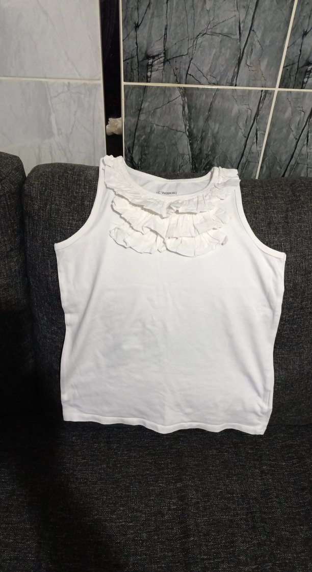Kolsuz beyaz keten bluz, yuvarlak yaka ve fırfır detaylı, rahat kesimli, günlük sokak stiline uygun.