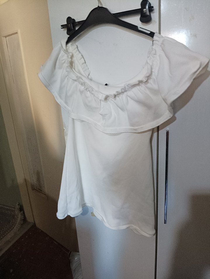 Yumuşak keten kumaştan, salaş kesim beyaz bluz. Önü fırfırlı ve kayık yaka, kısa kollu, rahat sokak stili için uygun.