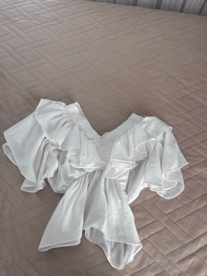 Beyaz keten kumaştan, V yaka ve kısa kollu, fırfırlı detaylara sahip, bol kesim mini boy bohem tarzda bluz. Sayılı giyildi marka temsili