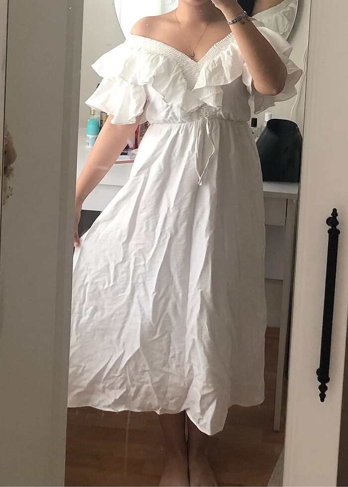 Fırfırlı beyaz midi elbise