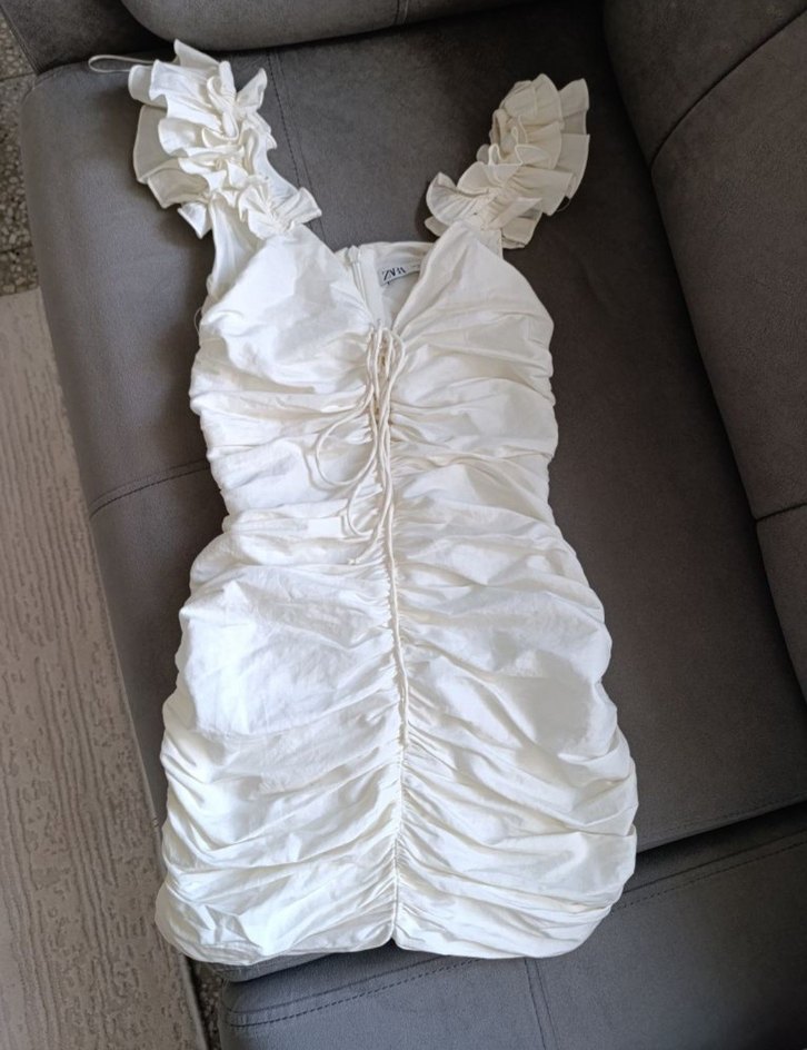 V yaka, fırfır detaylı, kolsuz beyaz mini elbise. 1 kere okul mezuniyetinde giyildi. Çok tatlıs mini elbise Büzgülü olduğu için fiziği güzel gösteriyor iç göstermez kolları düşük de kullanılır. Teklif verebilirsiniz