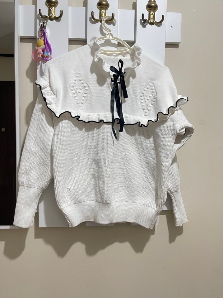 Beyaz örgü kumaştan, fırfırlı yakalı ve nakışlı desenlere sahip uzun kollu, salaş kesim kadın kazak. Günlük sokak stiline Paris esintisi katar. Temizdir bi kaç kez giyildi bi kaç yerinde küçük ipler çıkmış ama çok belli değil