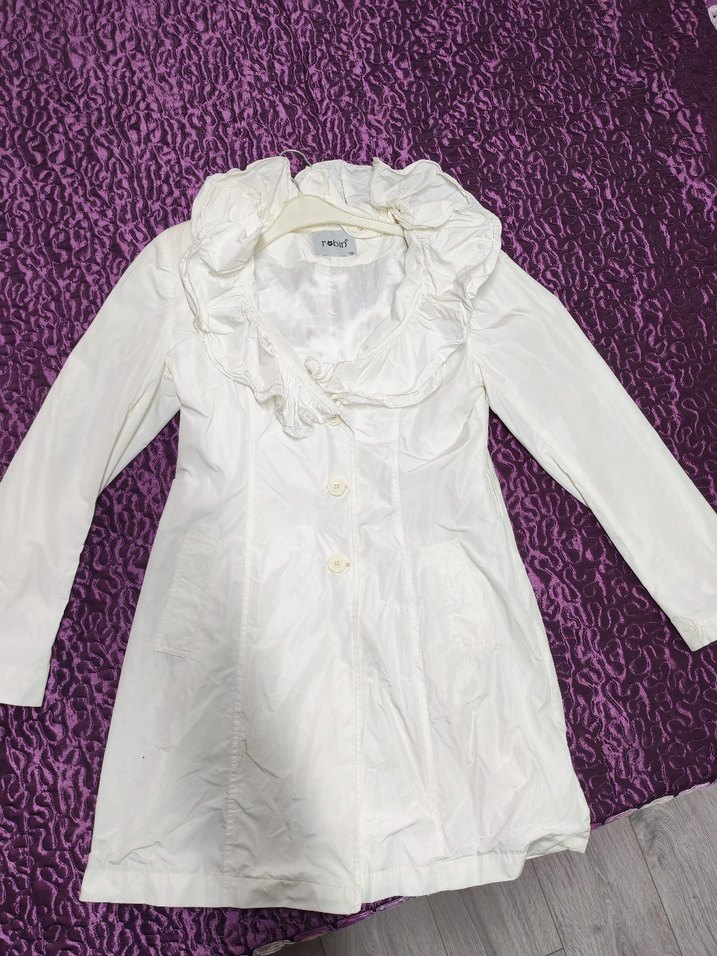 Paraşüt kumaştan, uzun kollu ve fırfırlı yakalı beyaz ceketi. Midi boy, bol kesim ve desensiz, şık sokak stili için uygun.