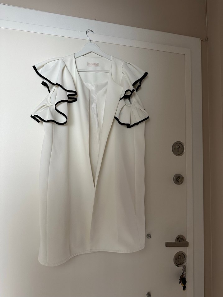 Siyah kenarlı fırfırlara sahip beyaz, straplez ve kolsuz yelek Sentetik kumaştan, kısa ve bol kesim, şık tarz