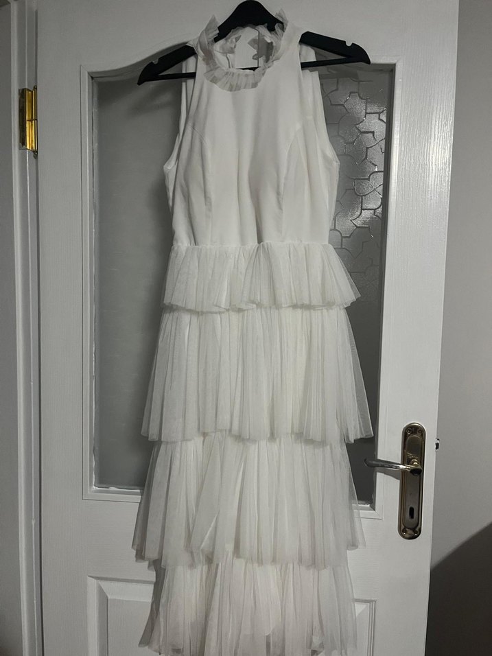 Yüksek yakalı, kolsuz beyaz uzun elbise, fırfır detaylarla ve vücuda oturan tam kalıp tüldür. Temiz üründür 1 defa giyildi midi boydur
