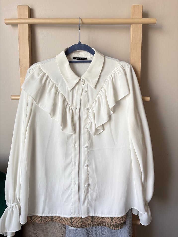 Beyaz fırfırlı detaylı uzun kollu bol kesim bohem tarzı gömlek. Ofis kullanımına uygundur. ✨