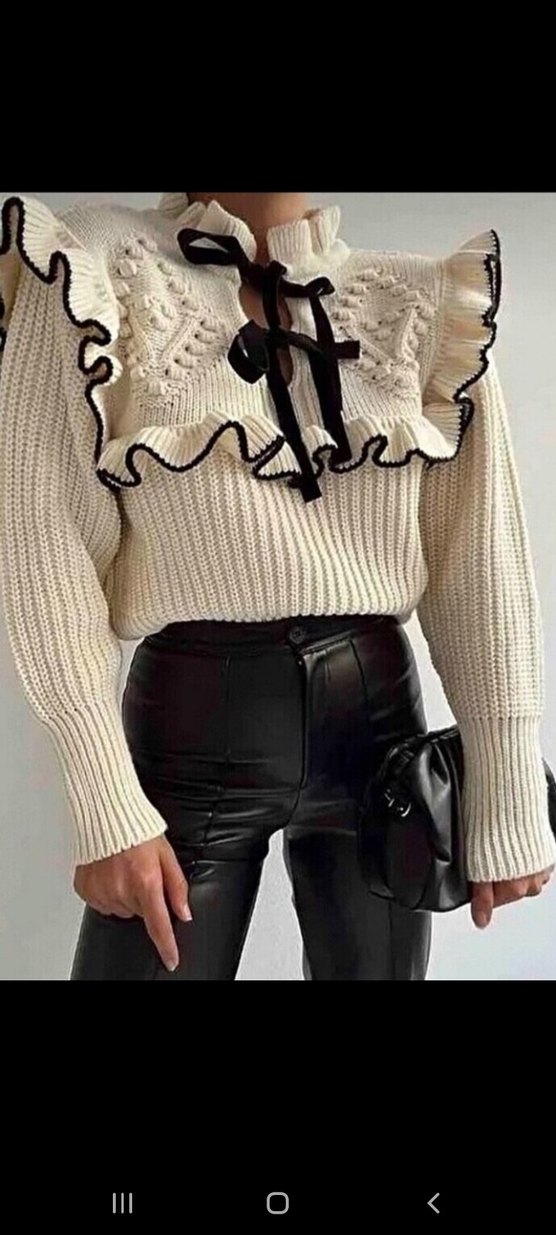Fırfırlı ve siyah kurdele detaylı beyaz triko kazak, V yakalı ve uzun kolludur.