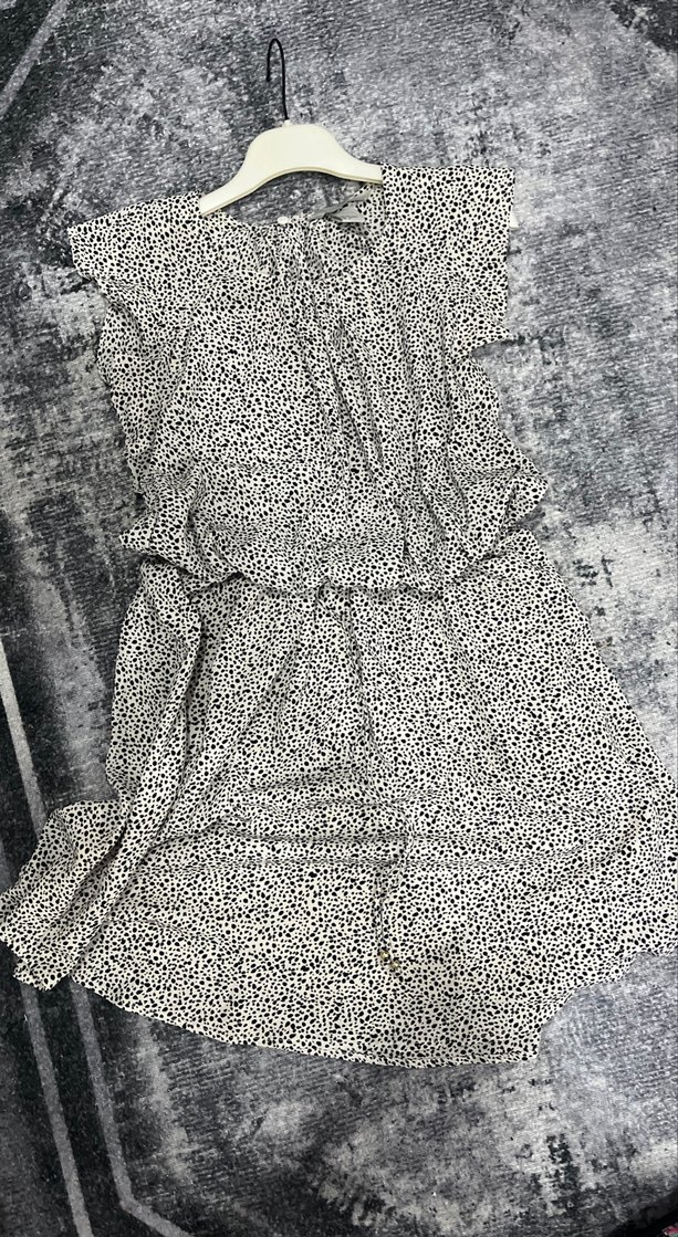 Beyaz ve gri yılan desenli, fırfırlı detaylı, sentetik kumaştan üretilmiş, bol kesim. Günlük kullanıma uygundur.