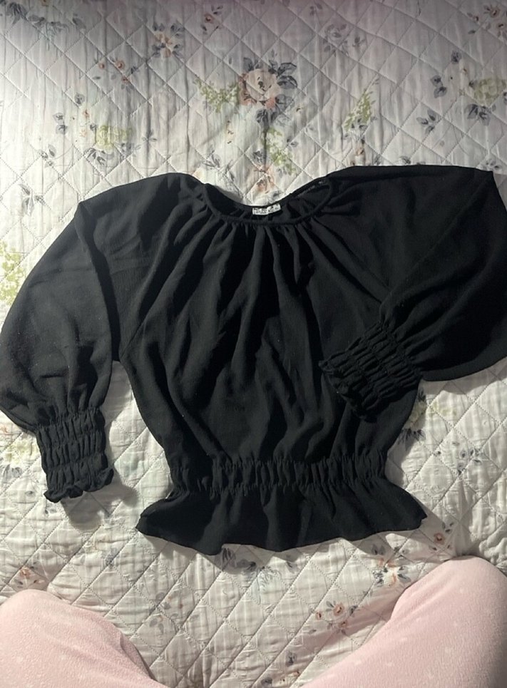 Siyah keten kumaştan, bol kesim, uzun kollu, yuvarlak yaka ve fırfırlı detaylara sahip gotik stil bluz. Desensiz ve midi boyda.