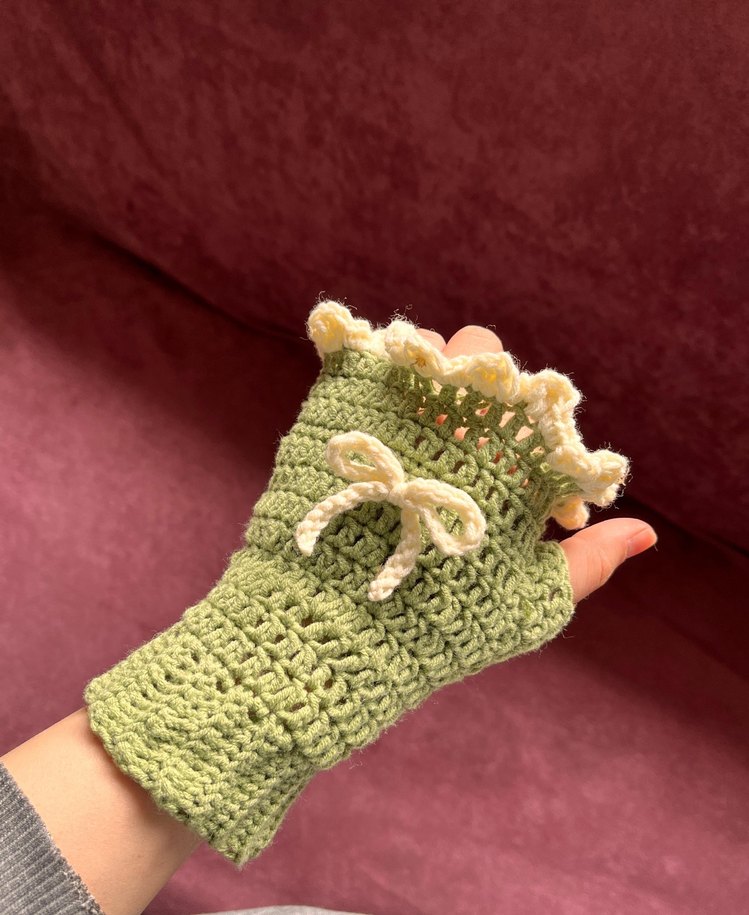 İsteğe bağlı renkleei değiştirilerek örülür Fırfırlı detaylı, fiyonk süslemeli pastel yeşil örgü eldiven. Bohem ve retro tarzı, parmakları açık tasarım içerir.