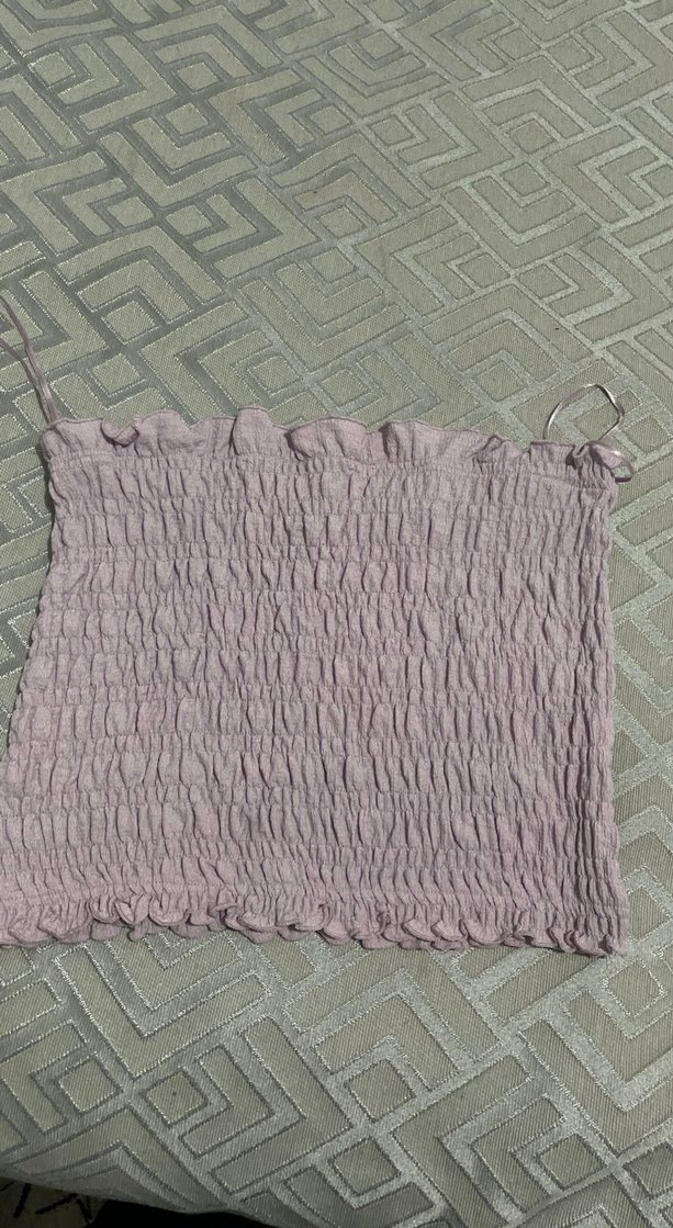 Keten kumaştan, fırfır detaylı ve işlemeli desenli, ince askılı, tekne yaka gri crop top. Rahat ve bohem tarzda, günlük kullanıma uygun.