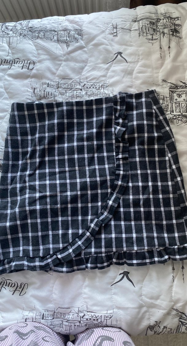 Gri ekose desenli keten midi etek, kenarında fırfır detaylarıyla modern sokak stilini yansıtıyor.