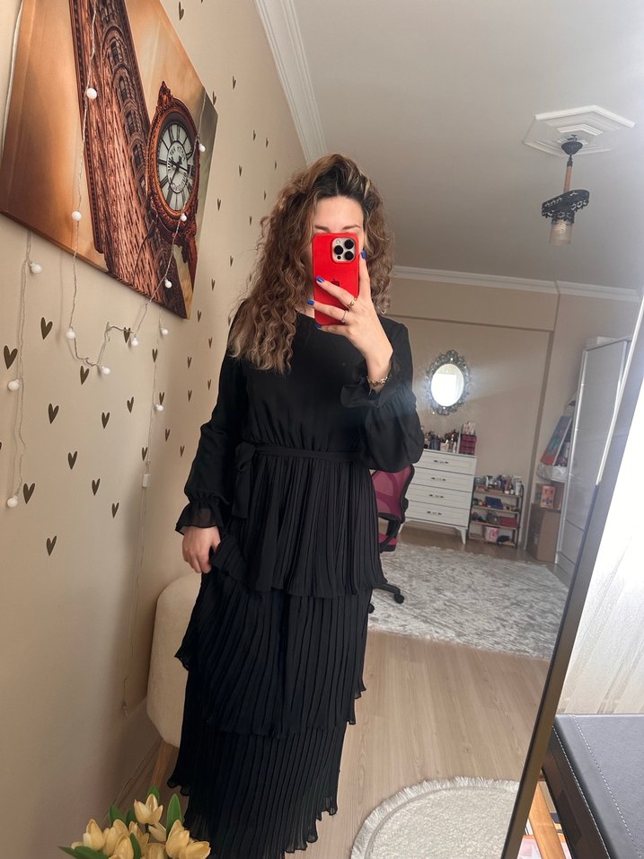 Siyah uzun elbise, pilili katmanlar, bol kesim, uzun kollu ve yüksek yakalı, yumuşak sentetik kumaştan günlük tarz için uygundur. Nir kere giyildi temiz sorunsuz
