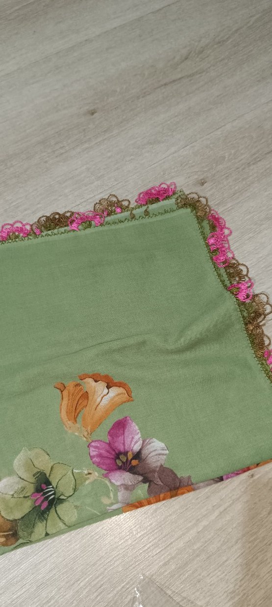 Kadınlar için haki renkli, pastel çiçek desenli tekstil fular. Fırfırlı kenarları ile bohem ve rahat bir tarz sunar.