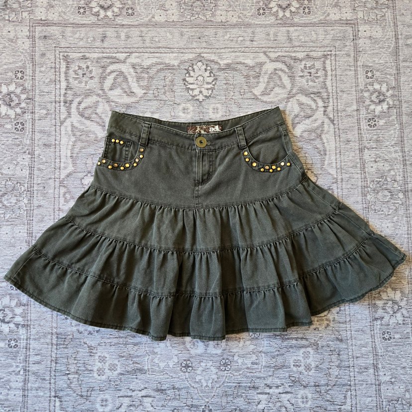 Adilışık haki kot etek, nakışlı desenler ve cepteki taş detaylarıyla bol kesim ve fırfır detaylarına sahip.