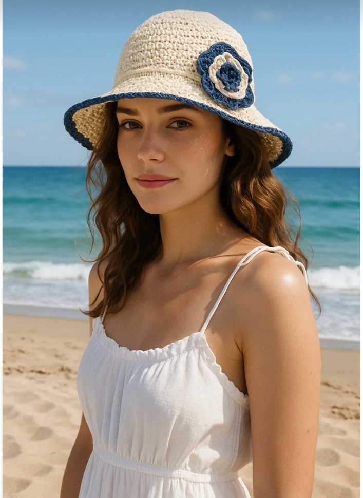 Açık hasır örgü bohem şapka, fırfır ve çiçek detaylarıyla retro ve hippie tarzına uygun .