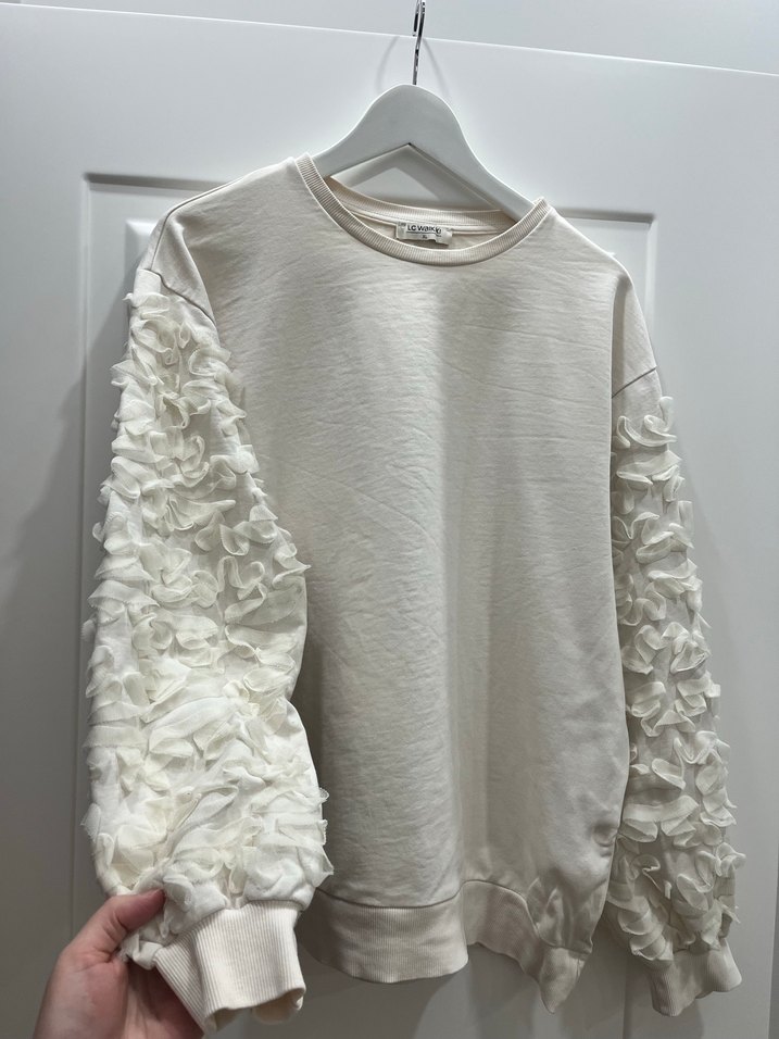uzun kollu,kollarında fırfır detaylı, bol kesim krem sweatshirt. Günlük kullanıma uygun, yuvarlak yakalı ve rahat sokak ya da ev stili.