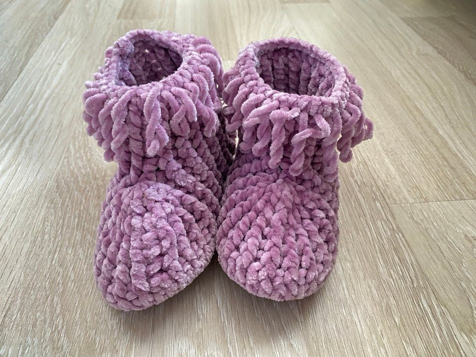 Mor renkli örgü kumaştan yapılmış kızlar için sıcak ev patiği, bohem tarzıyla rahat ve konforlu bir seçenek sunar.